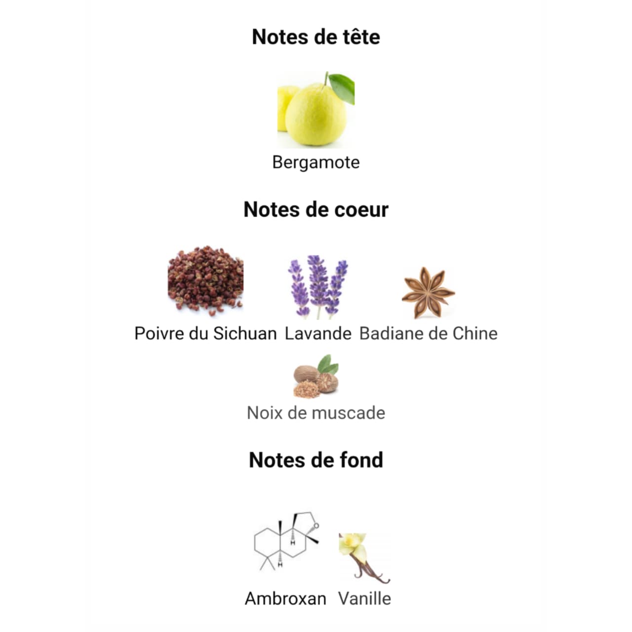 les notes de cœur sont Poivre du Sichuan, Lavande, Badiane de Chine et Noix de muscade ;