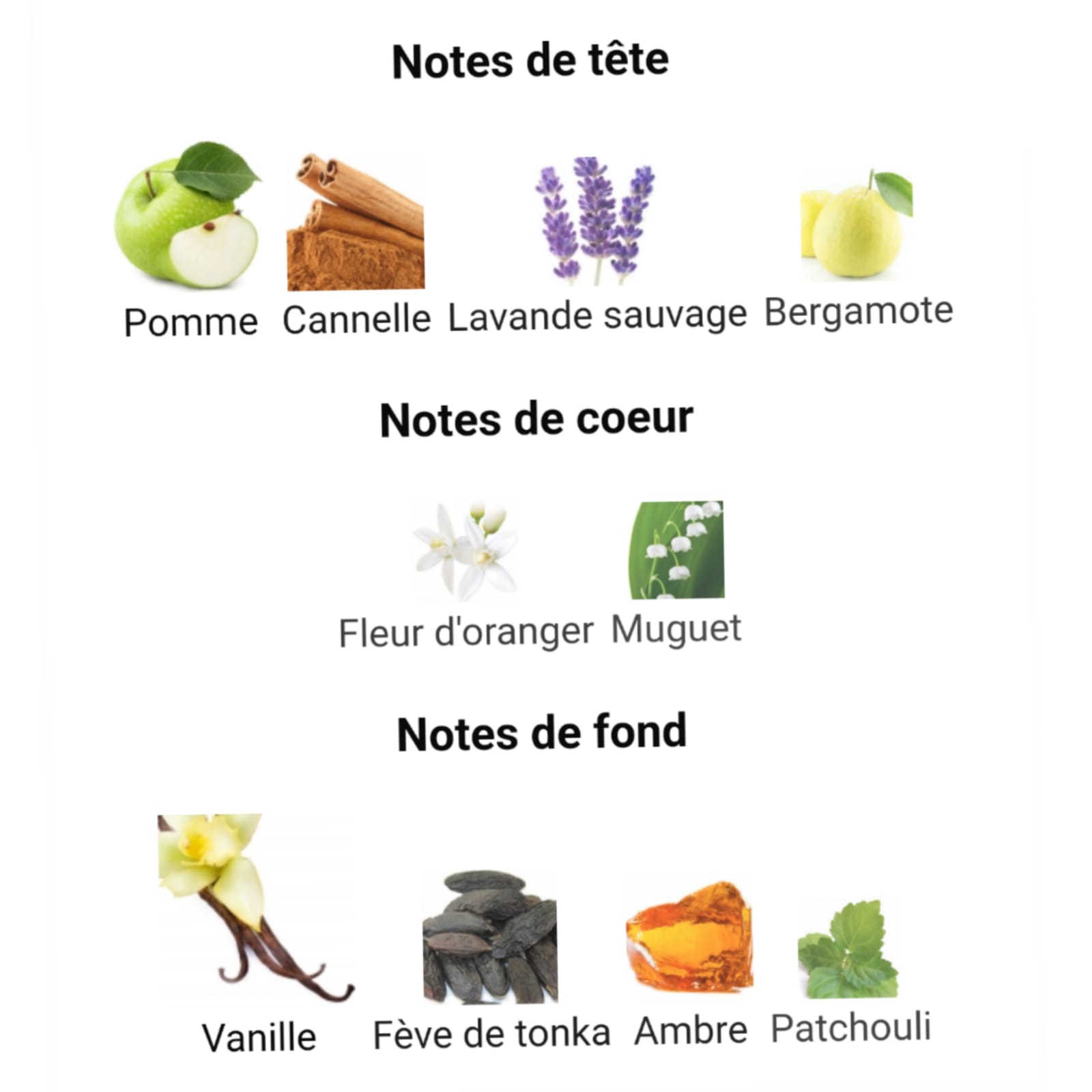 Les notes de tête sont Pomme, Cannelle, Lavande sauvage et Bergamote;