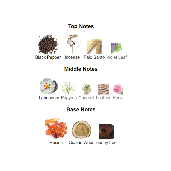 Top notes are Black Pepper, Incense, Palo Santo and Violet Leaf;