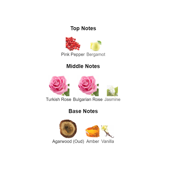middle notes are Turkish Rose, Bulgarian Rose and Jasmine;