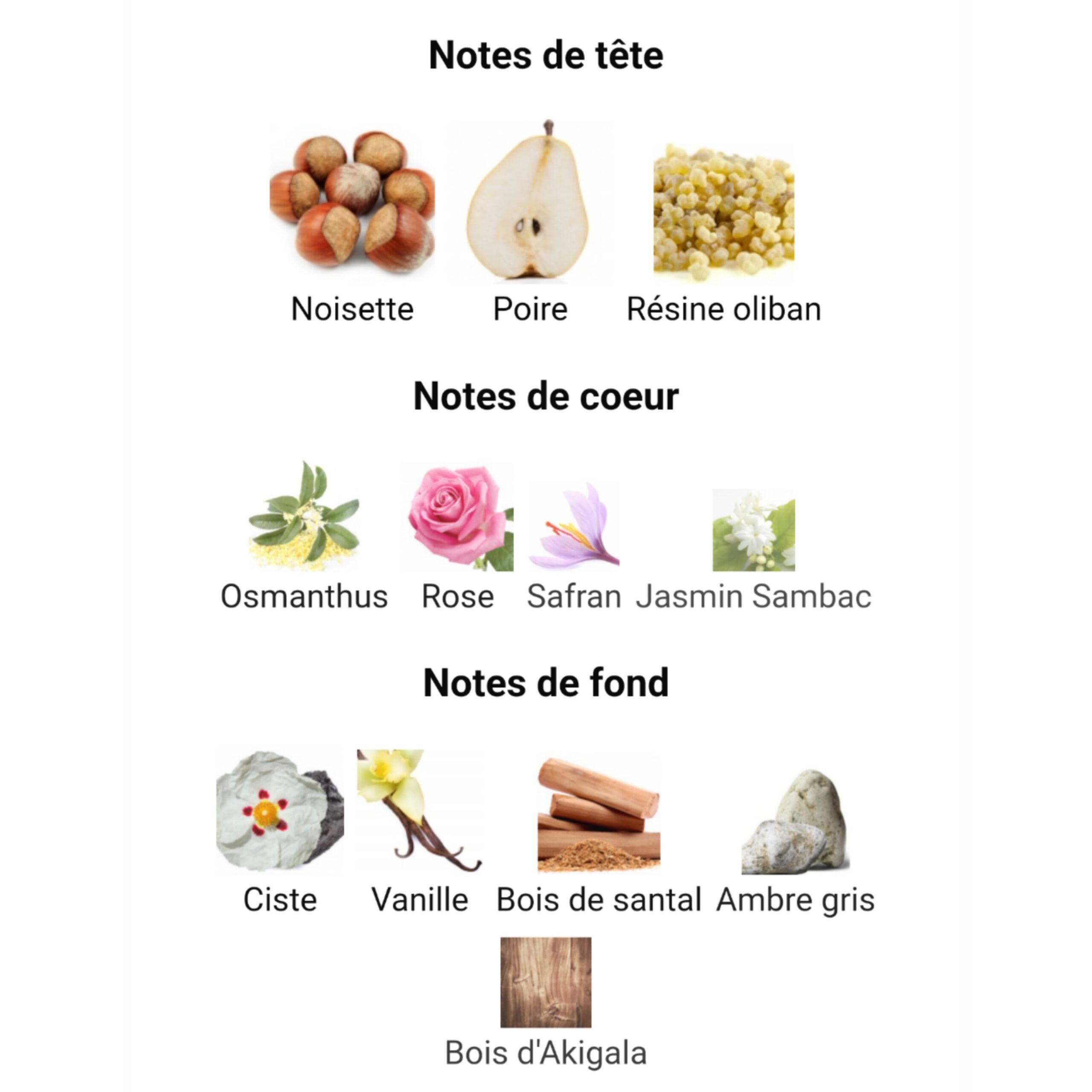 Les notes de tête sont Noisette, Poire et Résine oliban ;