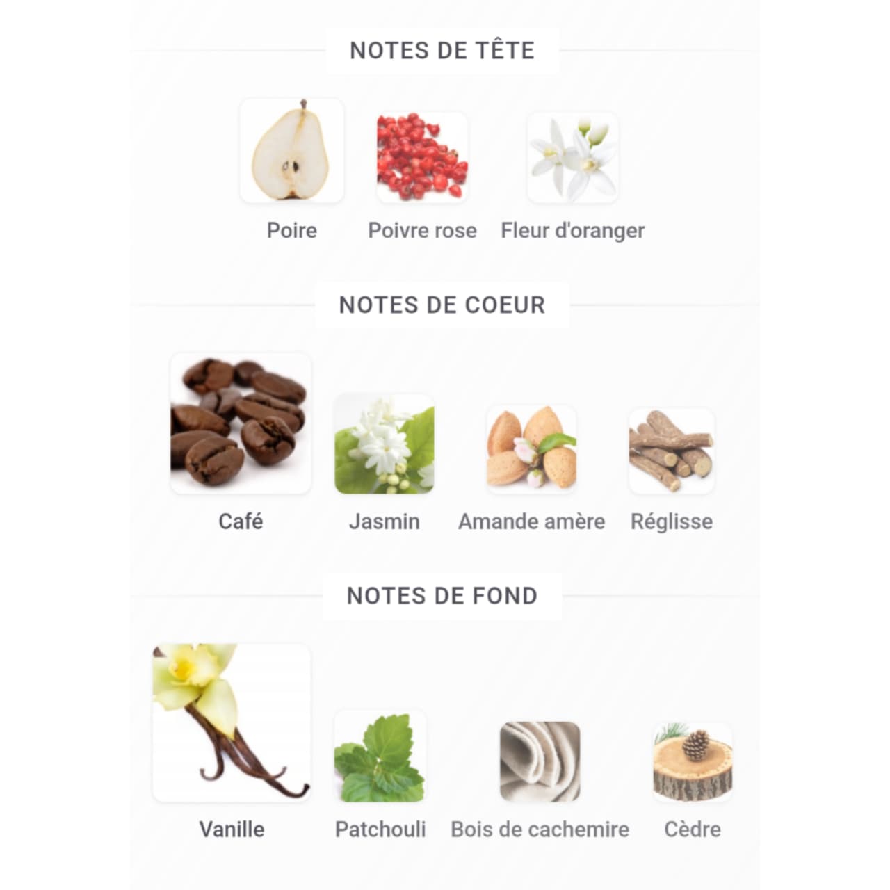 les notes de cœur sont Café, Jasmin, Amande amère et Réglisse ;