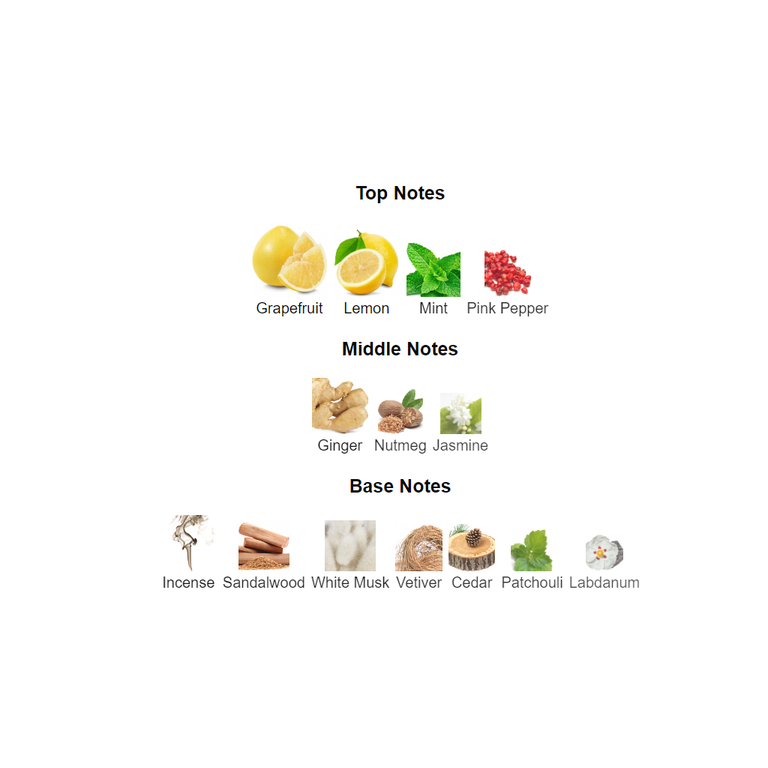 Top notes are Grapefruit, Lemon, Mint and Pink Pepper;