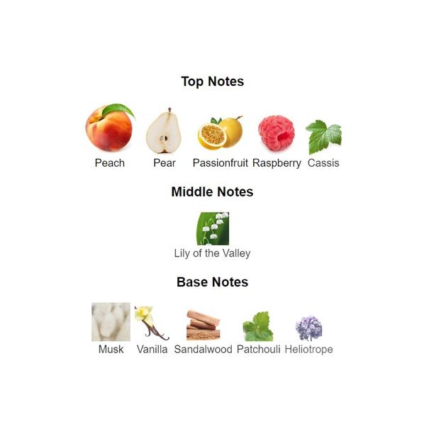 Top notes are Peach, Pear, Passionfruit, Raspberry and Cassis;