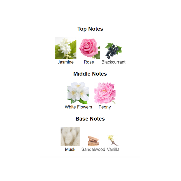Top notes are Jasmine, Rose and Blackcurrant;