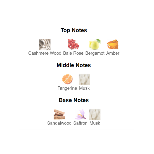 Top notes are Cashmere Wood, Baie Rose, Bergamot and Amber;