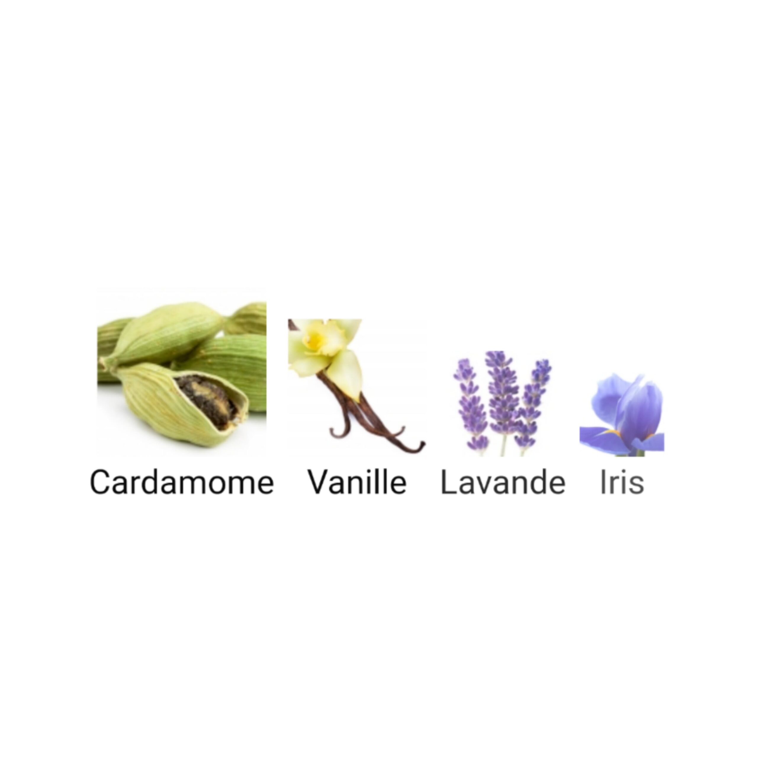 Top notes are Lavender, Mint, Cardamom and Bergamot;