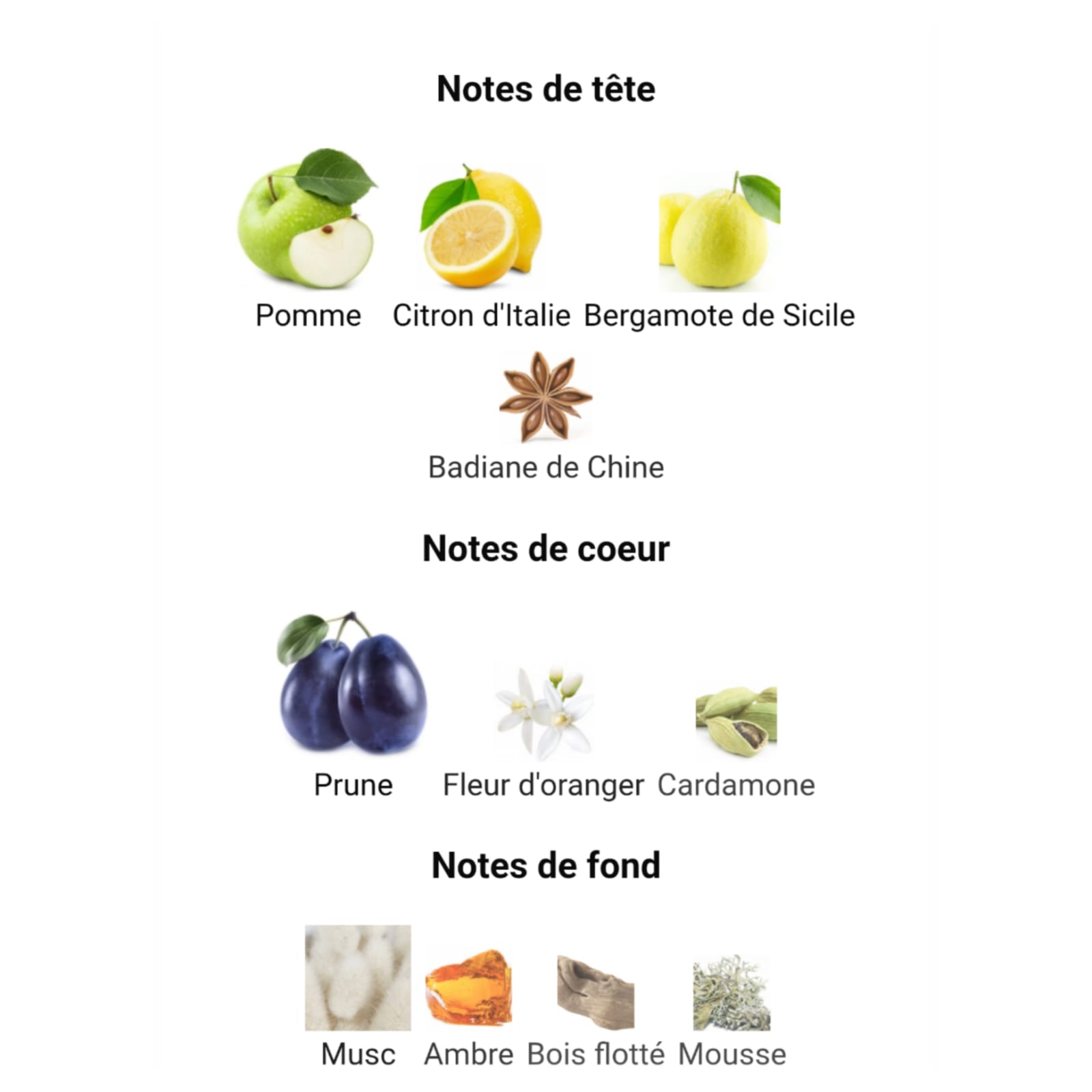 Les notes de tête sont Pomme, Citron d’Italie, Bergamote de Sicile et Badiane de Chine ;