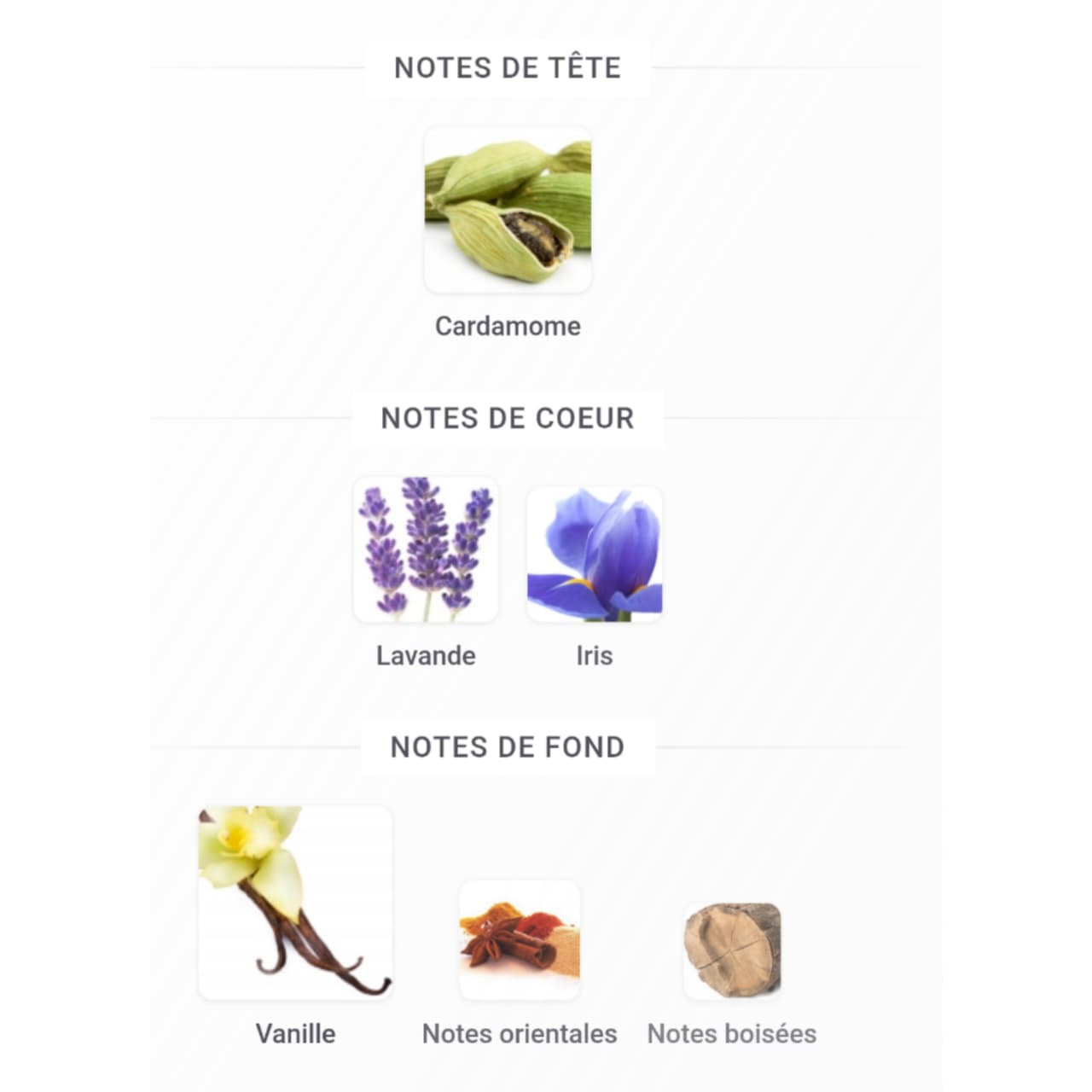 les notes de fond sont Vanille, Notes orientales et Notes boisées.