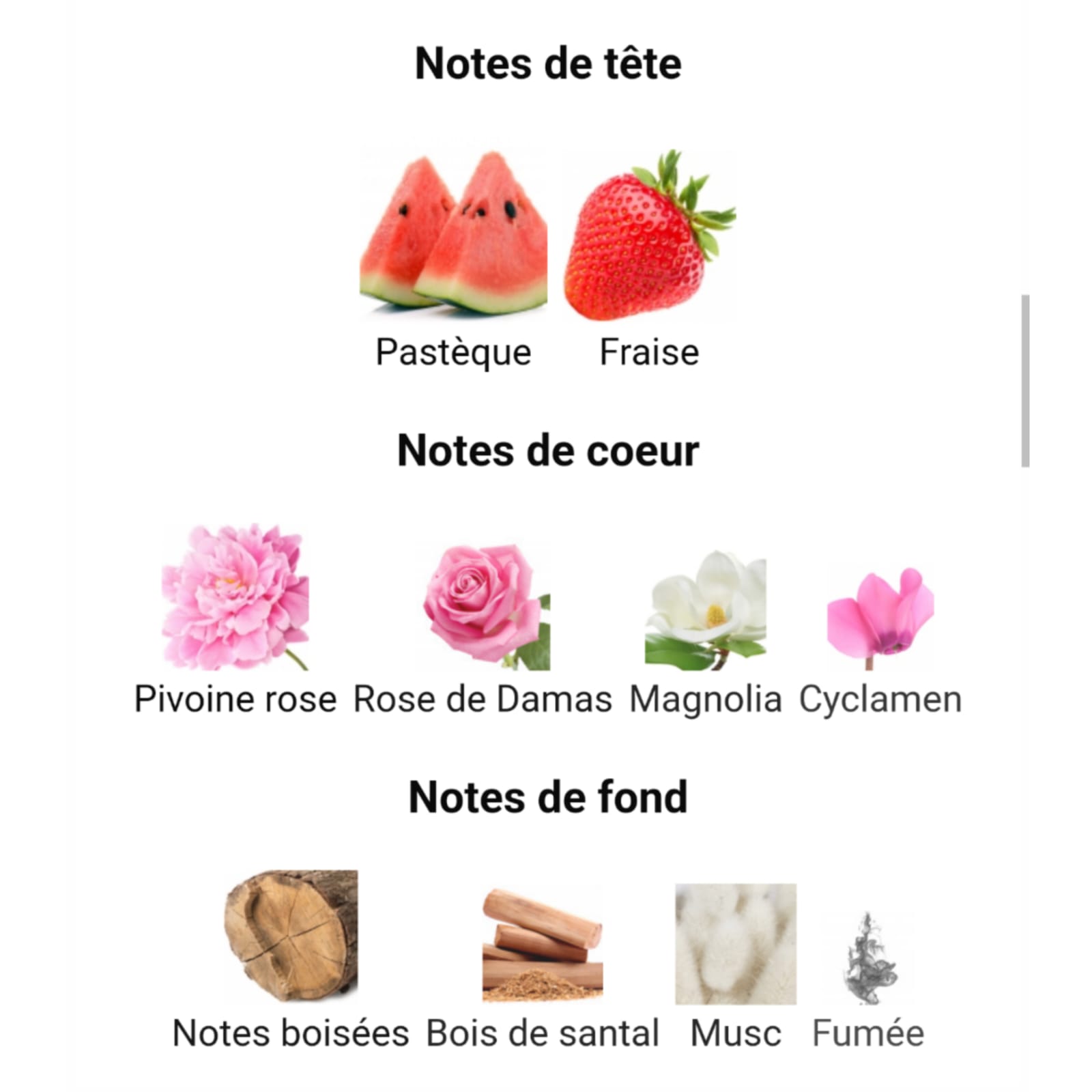 les notes de cœur sont Pivoine rose, Rose de Damas, Magnolia et Cyclamen;