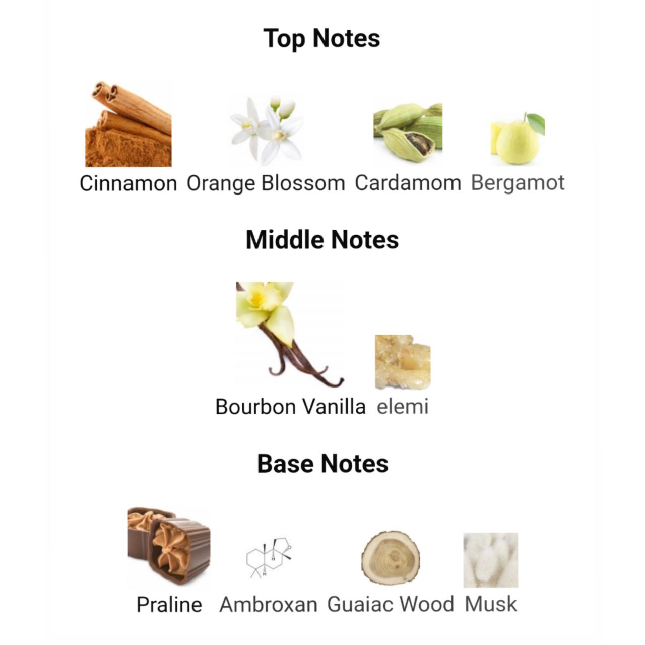 Les notes de tête sont Cannelle, Fleur d’oranger, Cardamome et Bergamote ;