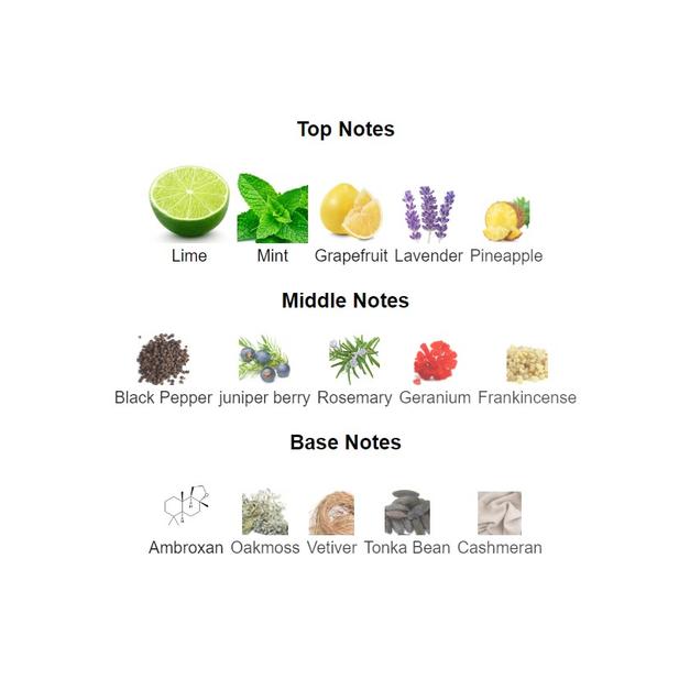 Top notes are Lime, Mint, Grapefruit, Lavender and Pineapple;