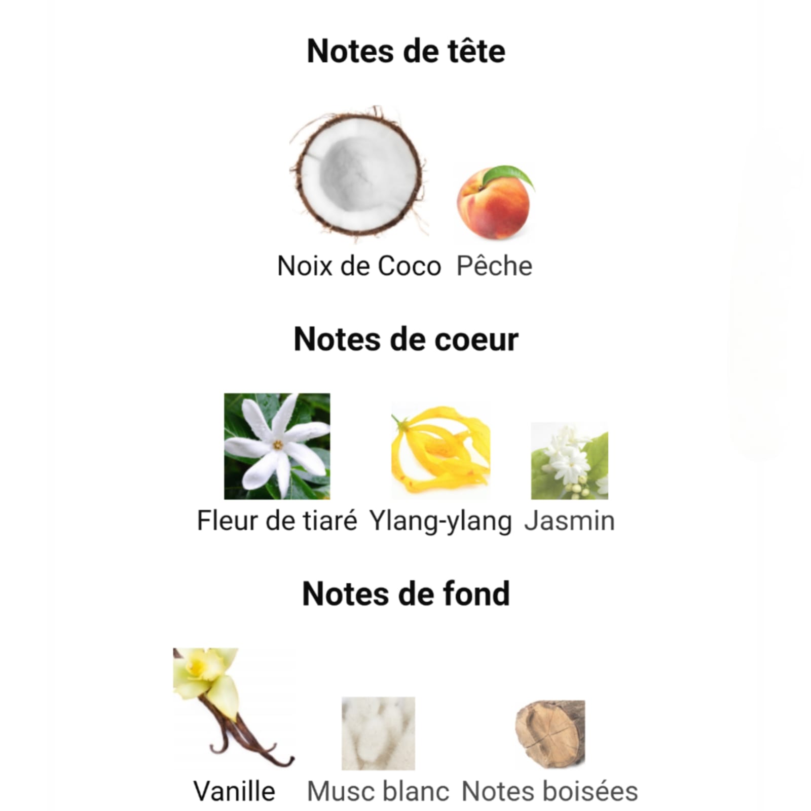 les notes de cœur sont Fleur de tiaré, Ylang-ylang et Jasmin.