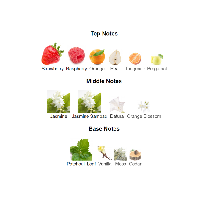 Top notes are Strawberry, Raspberry, Orange, Pear, Tangerine and Bergamot;