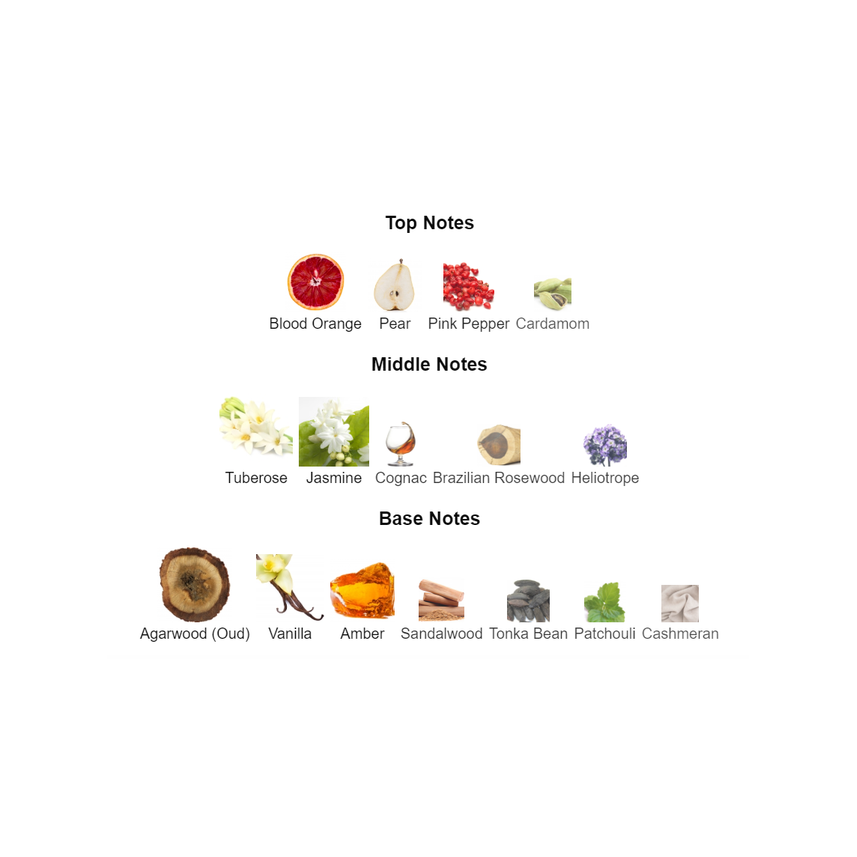 base notes are Agarwood (Oud), Vanilla, Amber, Sandalwood, Tonka Bean, Patchouli and Cashmeran.