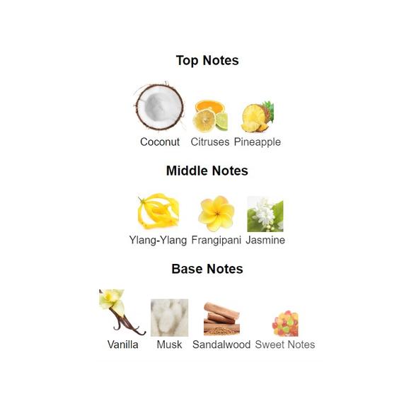 Top notes are Coconut, Citruses and Pineapple;