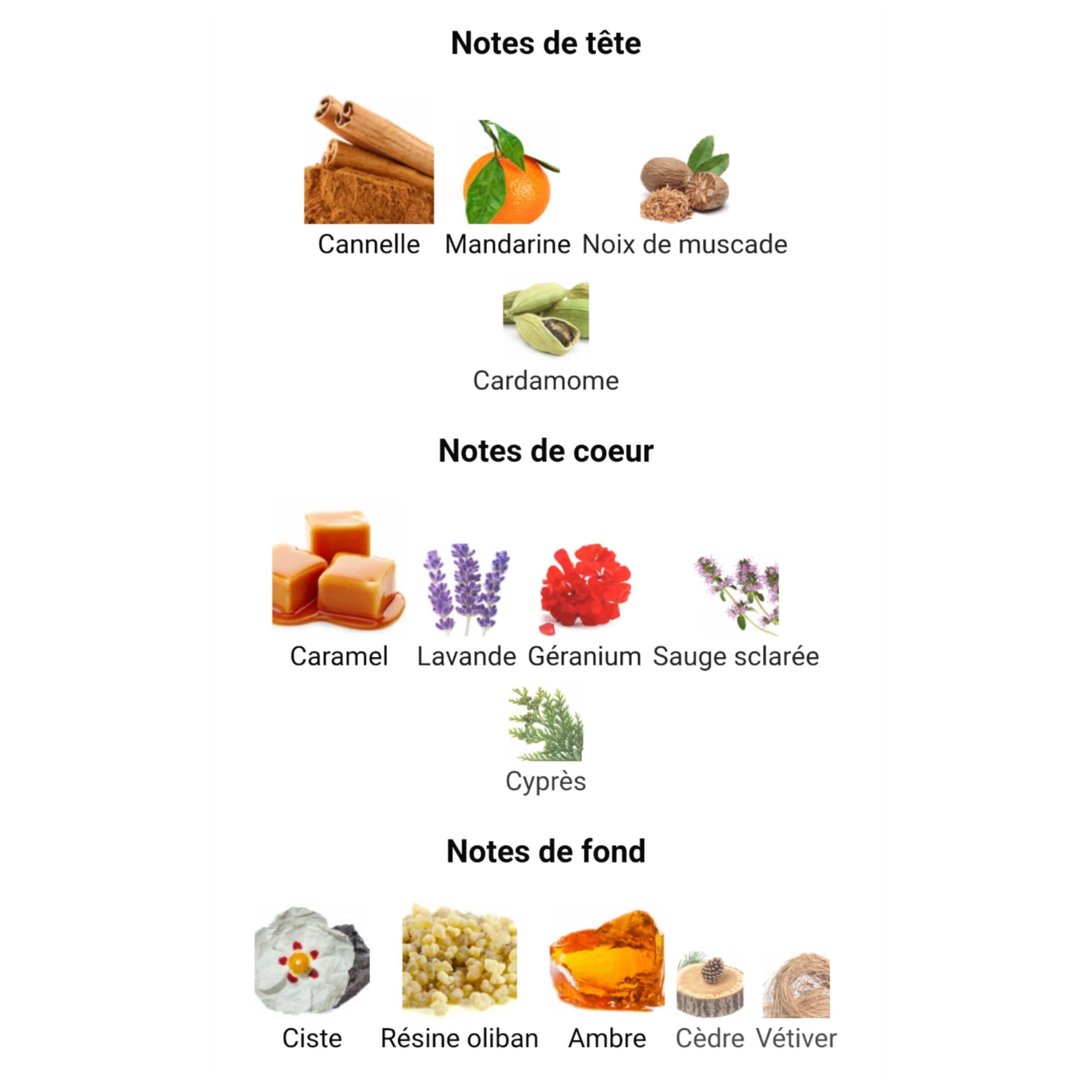 Notes de tête : Cannelle, Mandarine, Noix de muscade, Cardamome