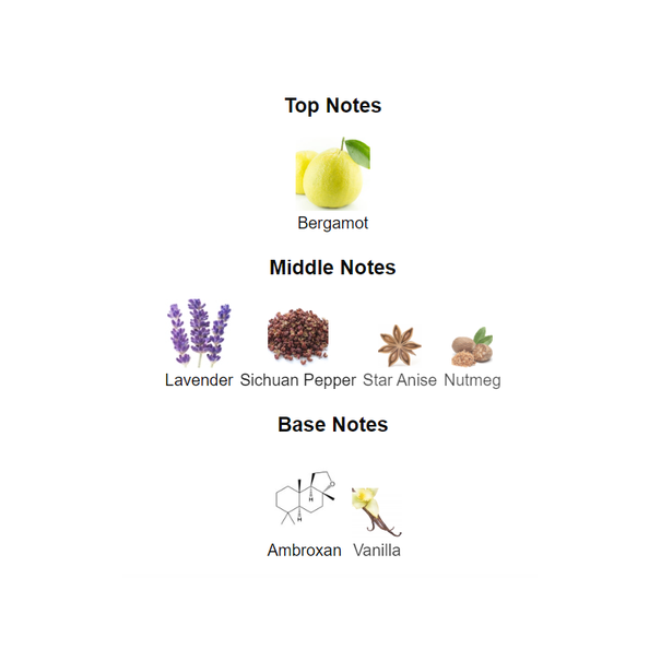 middle notes are Lavender, Sichuan Pepper, Star Anise and Nutmeg;