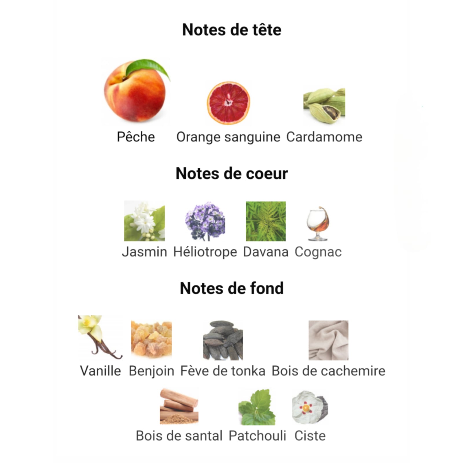 les notes de fond sont Vanille, Benjoin, Fève de tonka, Bois de cachemire, Bois de santal, Patchouli et Ciste.