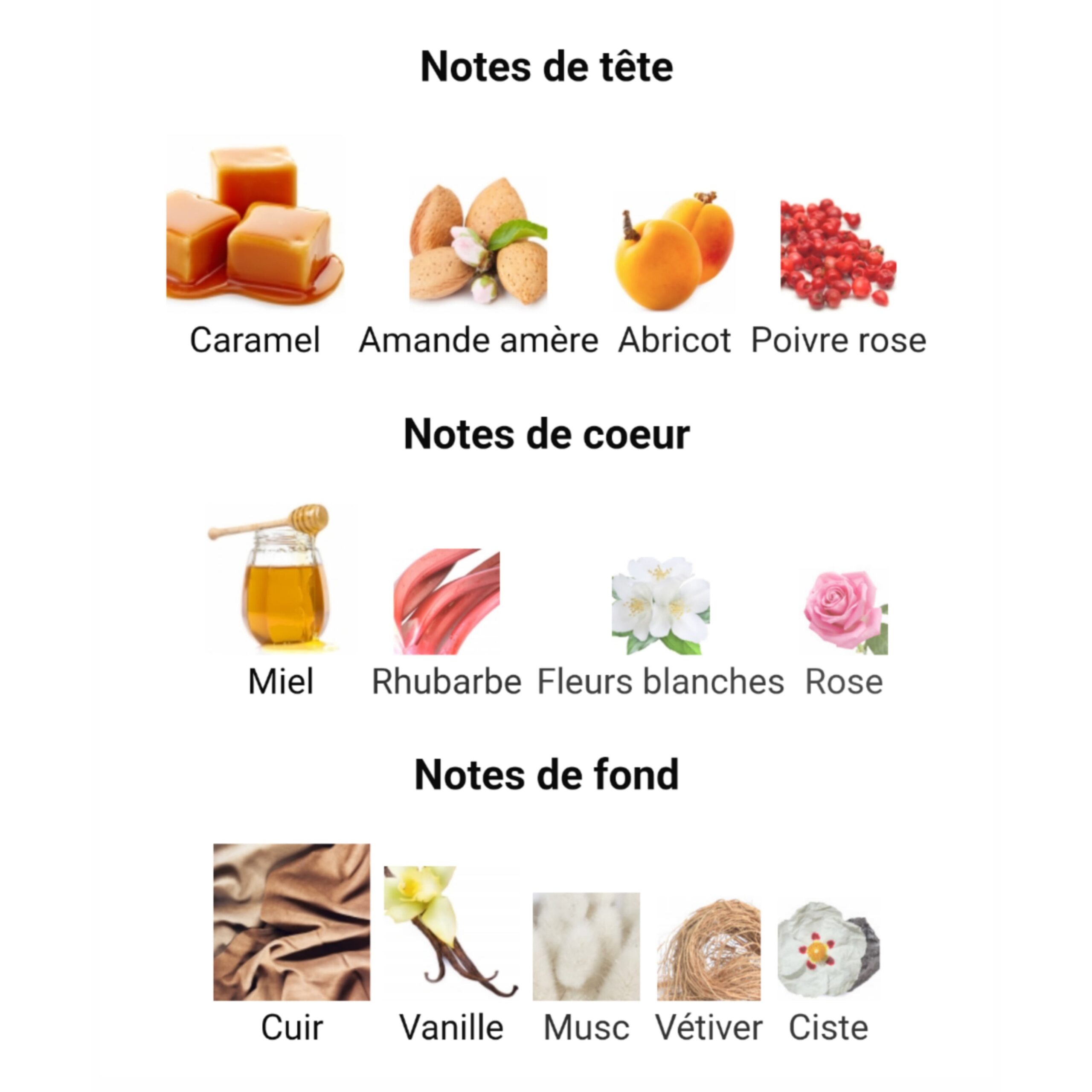 Les notes de tête sont Caramel, Amande amère, Abricot et Poivre rose;