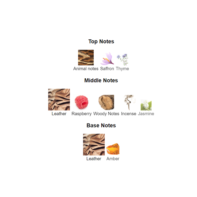 Top notes are Animal notes, Saffron and Thyme;