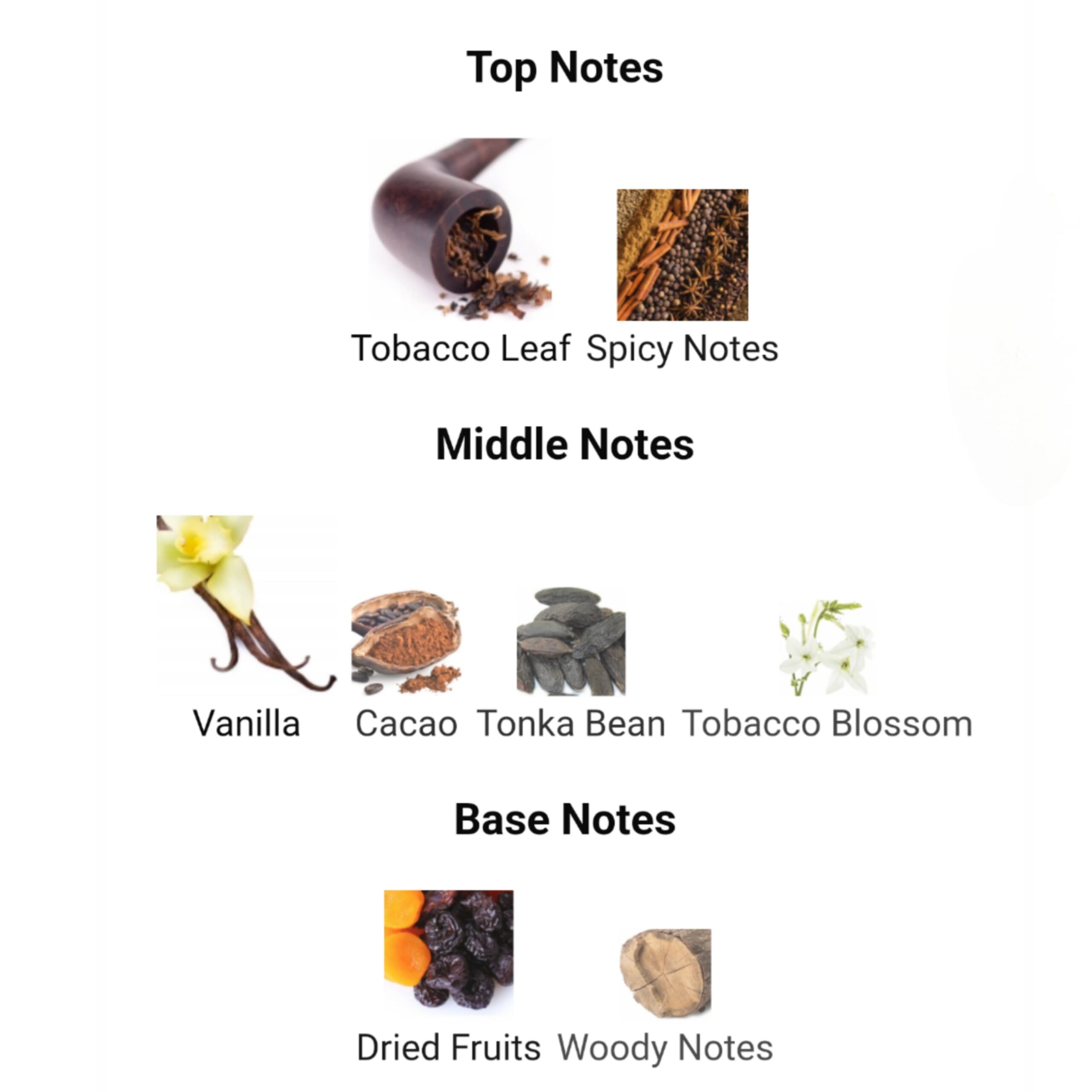 - Notes de cœur : Vanille, Cacao, Fève tonka, Fleur de tabac